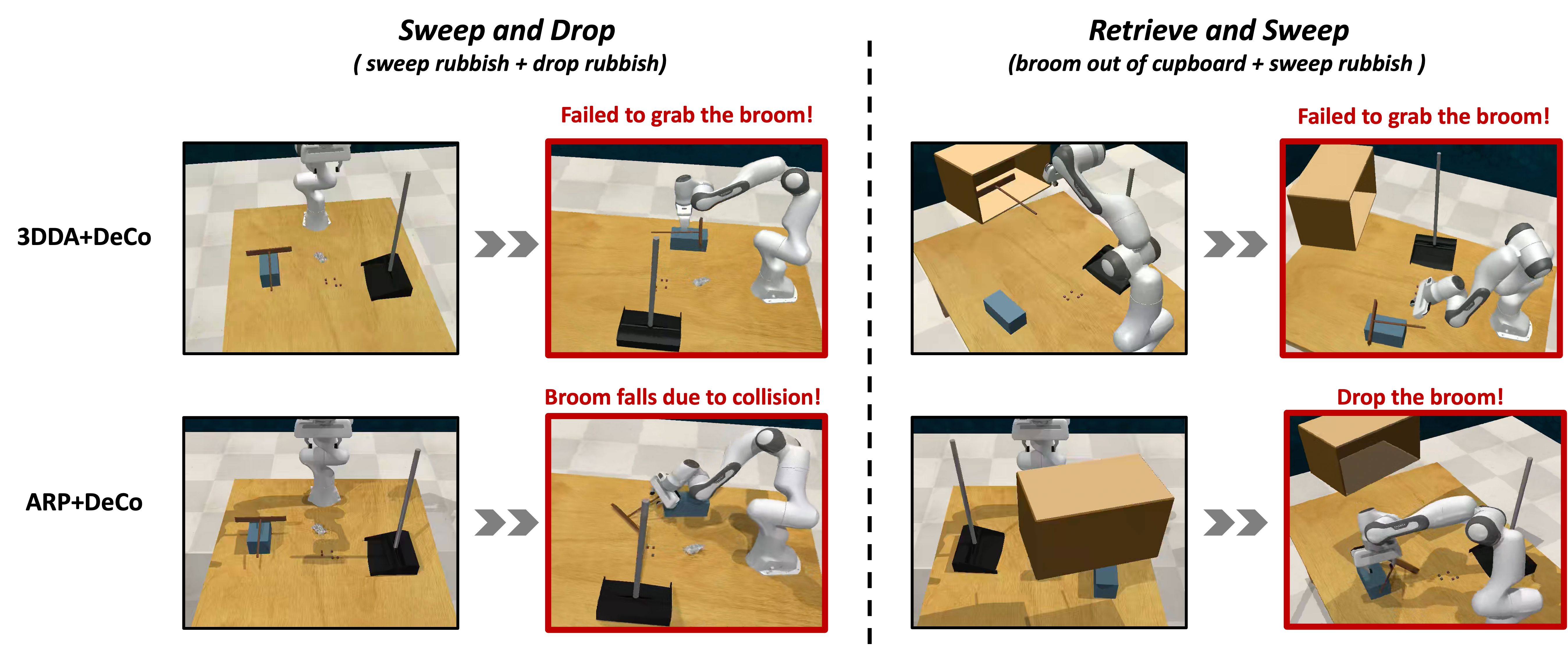 The ability of the base multi-task IL model to learn atomic skills is crucial for DeCo's generalization performance in long-horizon tasks. However, the model's generalization capability relies not only on its learning of atomic skills but also on other factors. Visual robustness is a key factor: different models have varying levels of visual robustness when confronted with previously unseen combinations in scenarios. If the base multi-task IL model's visual capability cannot effectively handle these variations, it will directly impact DeCo's ability to generalize in multi-task IL models when handling combined long-horizon tasks. We provide visual failure cases of 3DDA+DeCo and ARP+DeCo to further illustrate this limitation. Although 3DDA+DeCo and ARP+DeCo excel in learning atomic tasks, they encounter failures when facing the compositional long-horizon tasks Sweep and Drop (sweep rubbish + drop rubbish) and Retrieve and Sweep (broom out of cupboard + sweep rubbish). Even though DeCo can plan and schedule the corresponding atomic skills, both 3DDA and ARP struggle with visual processing in unseen combination scenarios. As a result, 3DDA+DeCo and ARP+DeCo fail to execute the atomic skills, which prevents them from completing the entire long-horizon tasks.